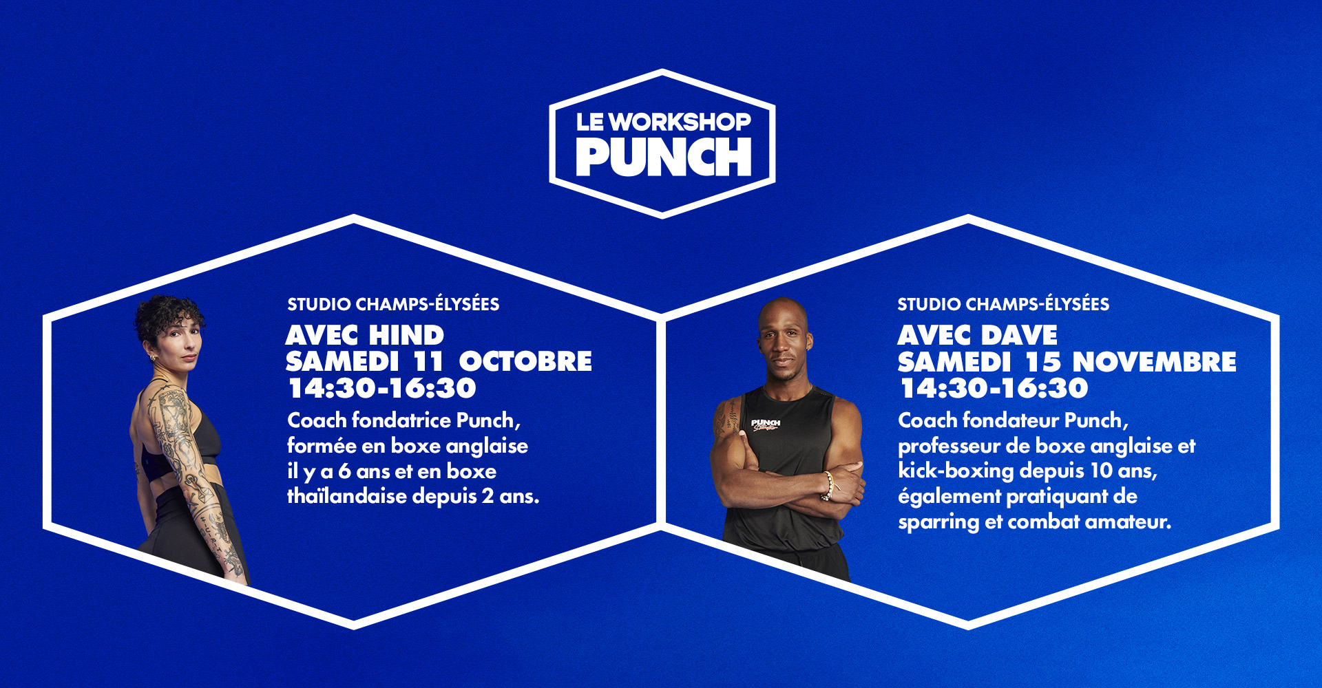 Chaque workshop aborde un focus et des exercices différents choisis par le coach. Ces ateliers vous permettent d’approfondir les bases de la boxe anglaise, mais aussi de découvrir des techniques avancées et des enchaînements spécifiques. Ils se dérouleront au studio Punch Champs-Élysées, en petit groupe afin de vous assurer un suivi personnalisé par nos coachs fondateurs.